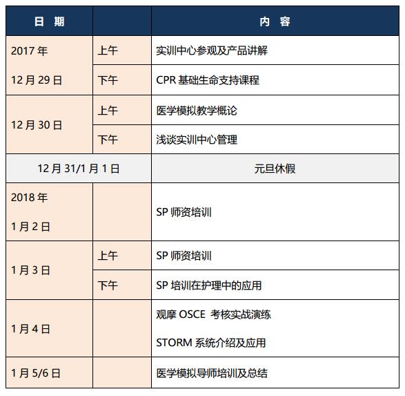 目前医学模拟教学最广泛应用于高风险领域的危机处理培训;例如心跳骤停,困难气道的处理,各种休克的处理等,这些疾病以少见却致命且迅速恶化为特点,无法在真实病人身上练习,所以必须借助模拟工具。模拟教学因其安全和可重复性以及为学习者提供标准化培训及反馈等特点,逐渐成为医学从业人员接受训练和获取临床经验的一种重要教学方法。因此模拟教学师资培训、标准化病人(SP)导师培训班以及实训中心的运营和管理也成为了各地区教学单位迫切需要的环节。